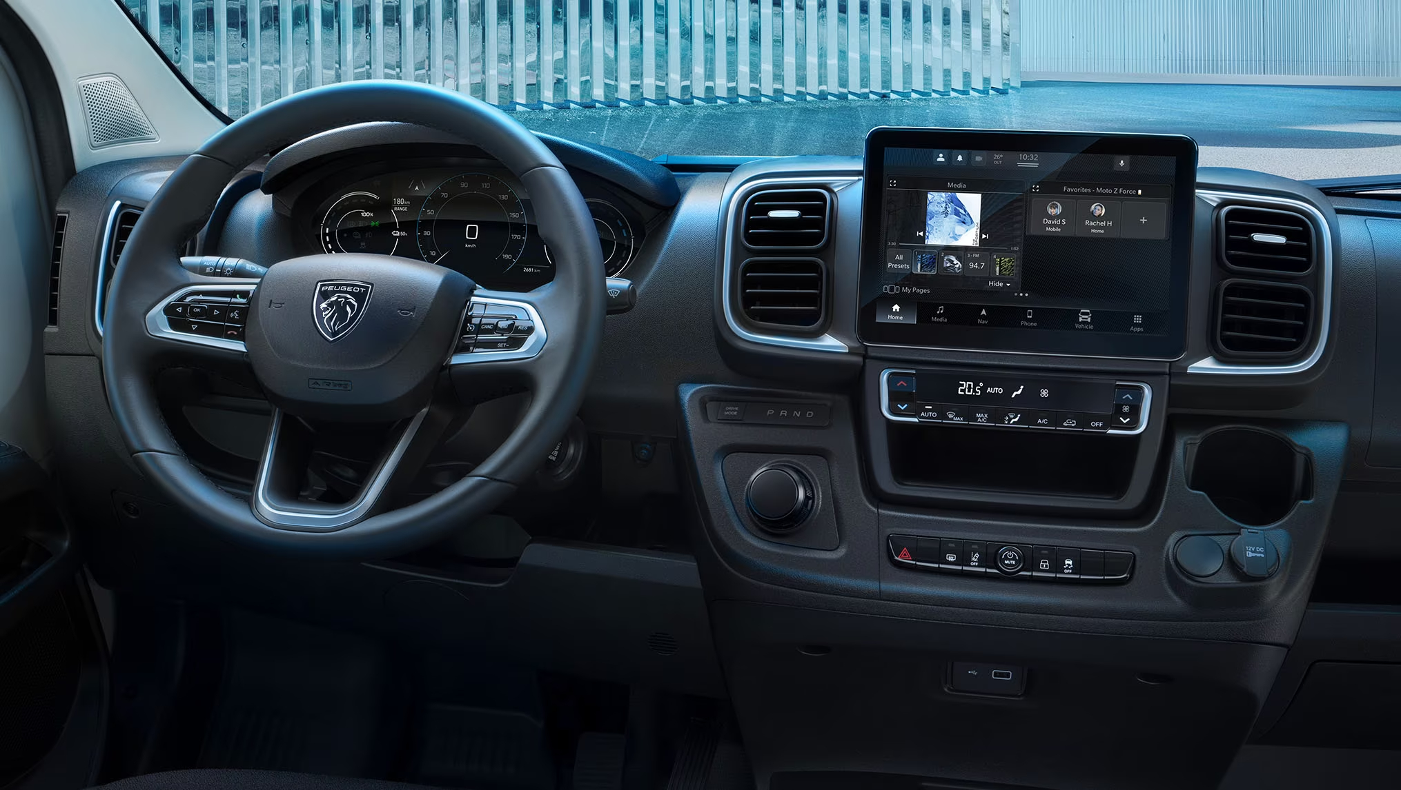 Jaunajā Peugeot e-Boxer ir visaptveroša informācijas un izklaides sistēma, kas tiek pārvaldīta, izmantojot lielu centrālo skārienekrānu, kurā ietilpst TomTom® 3D savienotā navigācija un bezvadu savienojums ar Apple Car Play™ un Android Auto™.